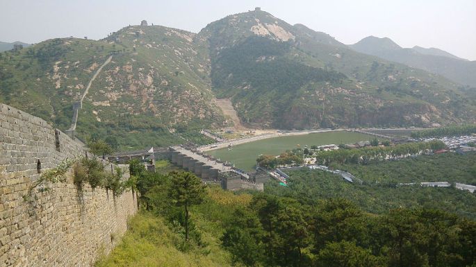 九门口长城(绥中九门口长城),坐落在绥中县境内,距山海关15公里,全长1704米。其南端起于危峰绝壁间,与自山海关方向而来的长城相接。自此,长城沿山脊向北一直延伸到当地的九江河南岸,在宽达百米的九江河上,筑起规模巨大的过河城桥,以此继续向北逶迤于群山之间。“城在水上走,水在城中流。”便是人们对九门口长城的形象描述。九门口长城,因其城桥下有九个泻水城门而得名,水势自西向东直入渤海,气势磅礴、壮观,是自然景观和人文景观的完美结合,因而享有“水上长城”的美誉,2002年被联合国教科文组织评为中国东北地区唯一的世界文化遗产。