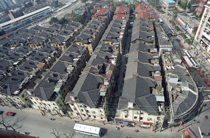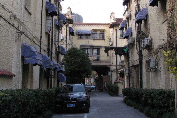 为了更清楚地展示“愚谷邨” 的全貌,从网上下了一张俯瞰拍摄的照片。浅黄色外墙、青瓦坡顶,整齐的连排建筑格式,要知道这可是在85年前就已经建成了的,叹为观止噢(要不是后来人们在晒台上私自搭建的小屋、以及阳台上随意安装的晾衣架,景观还要整洁靓丽好多)!画面下端的横马路是乌鲁木齐北路,而右手那条就是愚园路。