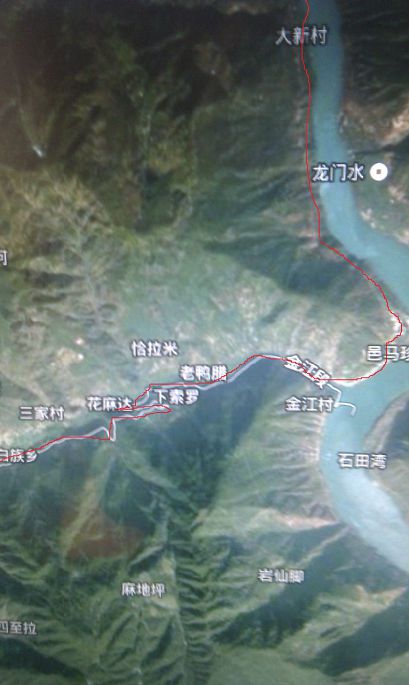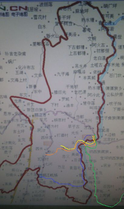 线路3(黄色):丽江-金安桥-梓里-梓里桥-下金安-羊见-震青山-金器特古(喝水处)-良美,1天或2天。