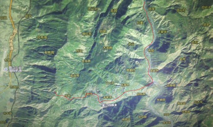 金江乡政府驻地到七河三义飞机场边的公路有45公里,是山间盘旋蜿蜒的乡村公路,沿着公路可徒步一天,爬坡路段较多,较费体力。由于某个原因,我们三人决定第二天(19日)搭乘金江丽江班车回丽江,班车票是每人28元。