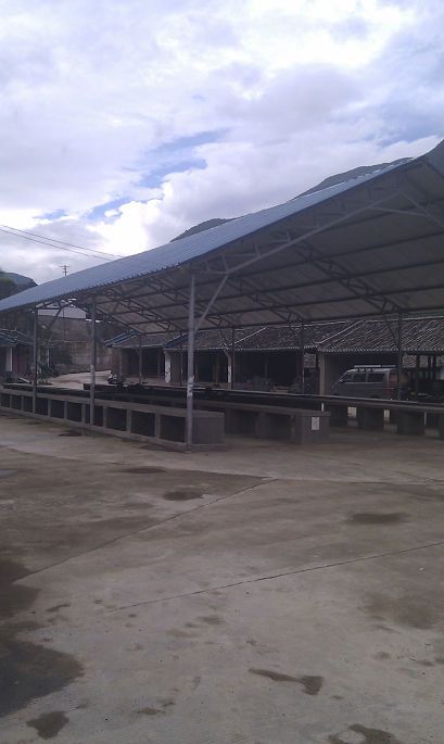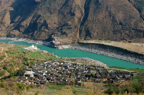 过了七,八公里,到了房屋和村道都崭新的金沙江水电开发影响到的移民新村-金安村。原金安村现在完全淹没在金沙江中了,它在金安乡曾经繁华热闹一时,现在是空空的房屋,市场,还有空空大大的金江小学(原金安中学校舍,现归并到丽江古城金虹中学)。村里有一家客栈,一家小卖铺,一个小饭馆。当天,饭馆客栈都没人,可能是因为不逢集。金安村是丽江到金安班车的终点站,每天一班,早七点出发。
