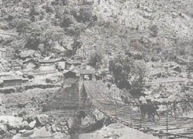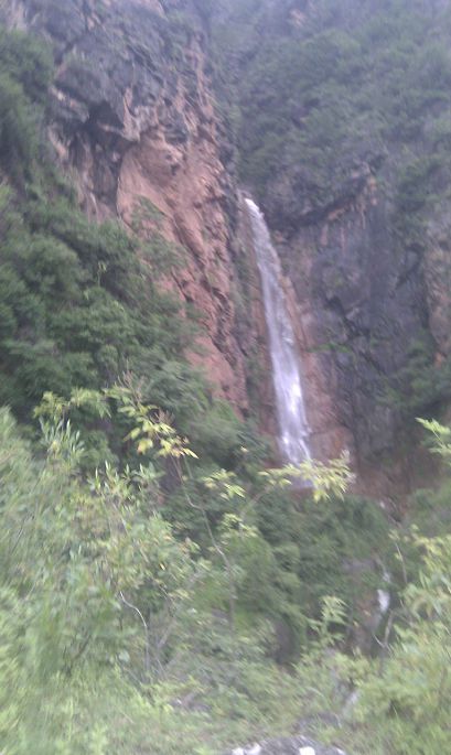早8点45分,我们搭乘丽江到永胜的班车(每半小时有一班),10点左右就到了金安桥头。在桥头加油站下车休息时打听到旁边有一条路通到往金江的江边公路,于是我们迅速拿下背包开始徒步了。丽永公路边的加油站的西南方向有一条水泥路,走了50多米就找到了江边弹石路。走在弹石路上,下面是汹涌翻滚向东奔流的浑浊的金沙江,江两岸是高耸翠绿的大山,山上隔几公里就有长长的白色的缎带般的飞瀑,隔几百米就出现一条水流湍急水花飞溅的山涧,还有路边各种各样不知名的娇艳的野花,果实累累的橘子树和核桃树,美丽的绿油油的梯田,如画的三三两两点缀在山腰或山脚的山村人家,呼吸着河谷间清新沁人的空气,我们的精神为之一振,很是爽快。渴了,可以喝甘甜清冽的路边山泉水,饿了,可以吃路边所谓见者有份的橘子核桃(见到主人可以留一点钱)。