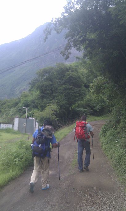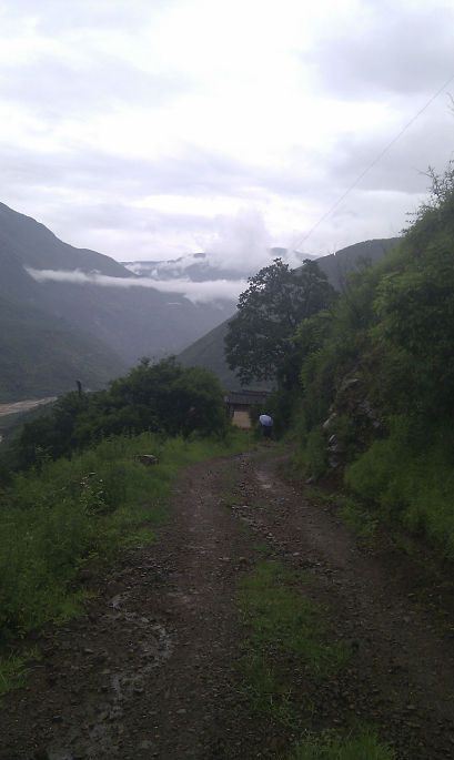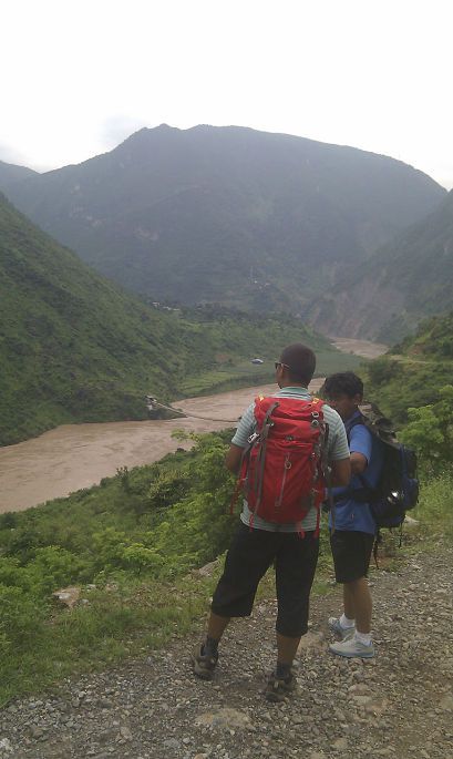 二零一四年八月十八日这一天,早上天阴。虽然天气预报丽江中到大雨,但是我们三人(小金,小铁和老实本人)还是按约定背上背包出发徒步金安桥到金江了。三人当中,小金的驴行经验丰富,精力充沛,小铁和我热情高涨。我们带足了两天途中午餐吃的干粮(火腿肠,粑粑,罐头,压缩饼干,水等),晚餐和住宿准备到村镇去解决,还配备了救生绳,登山杖,砍刀,雨衣等。