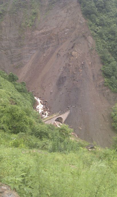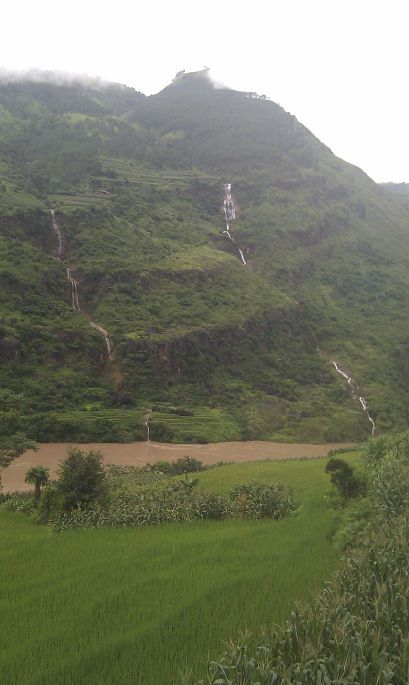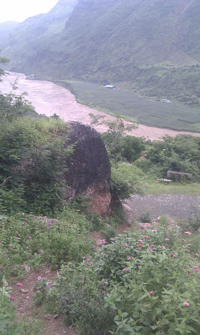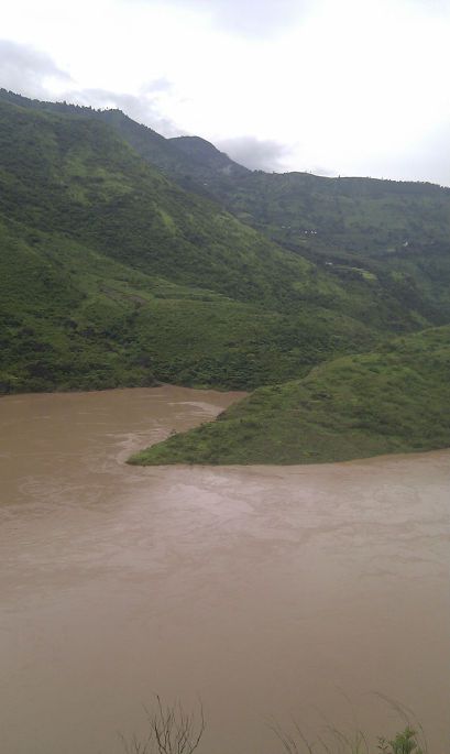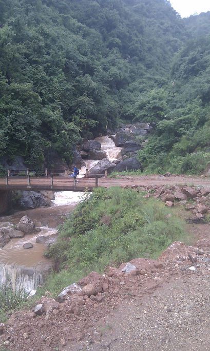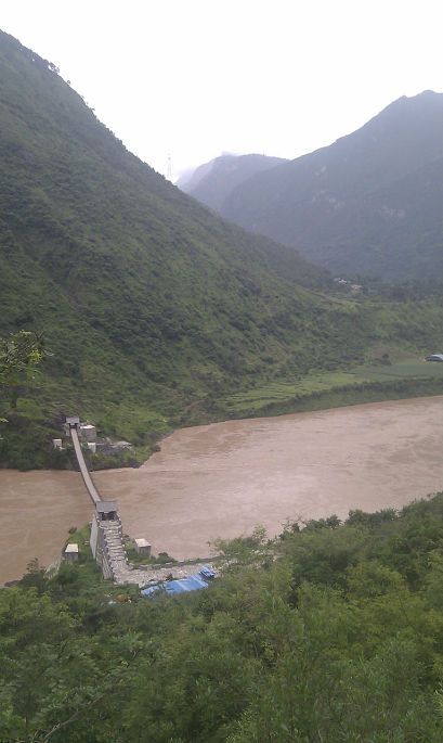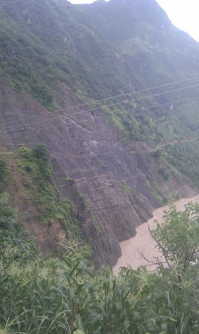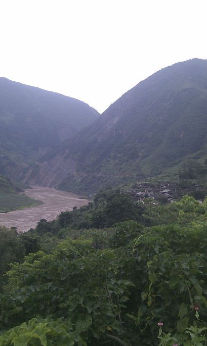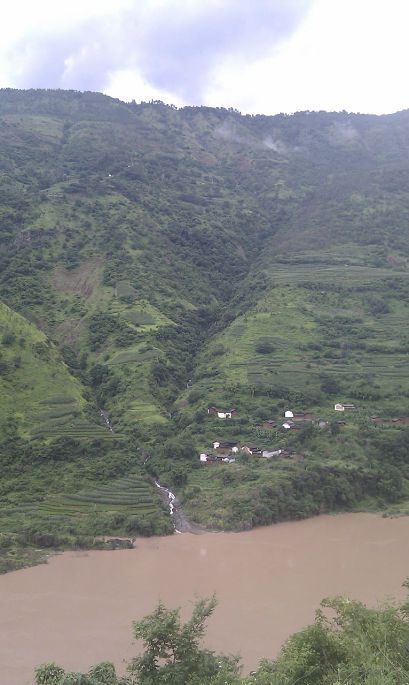 金沙江边,走半天,隔着六,七公里才见着一个村庄。在美阁到黄眉毛的这一段路上,沿途风景很美,飞瀑,清涧,山上人家,江中离堆(都江堰离堆似的)。但是现在雨季,美阁村成了孤岛,前后的公路都断了,或山体垮塌滑坡,或巨石石堆堵塞,整个雨季或只能这样,只能等雨季过后,到了旱季,政府派机械过来清理,修通。