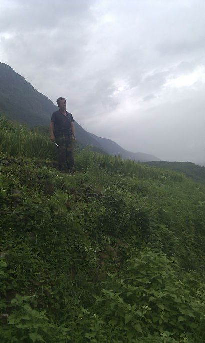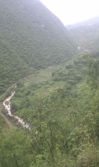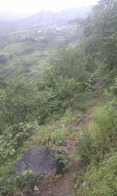 我们还是决定向上攀爬找到路。在密不透风的灌木荆棘中,砍刀派上了用途,需要砍掉荆棘开路上行。但是雨下得越来越大了,天也暗了下来,昏天黑地的,山坡又陡峭,爬了往下滑,需要手脚并用才能一点点的爬上去。我心里都有点担心了,要是老在这灌木丛里打转,天黑了也转不出去,找不到路,是不是就在这里露宿了;或者有个什么意外,不敢往下想了。幸运的是,一直往上,终于找到了古路,我们长舒了一口气,安全爬出灌木丛找到了路。顺着古道,还要往上走,直至差不多到山顶的垭口。到了垭口,见到了远处山坡上散落的蒙蒙细雨中的羊见行政村的建乐自然村。进入建乐村,择路向下到羊见河河边公路。这时,雨也停了,我们感觉绕过了马尾岩,经过了危险的一段路,非常高兴。快到下午两点了,我们为绕过一百多米的马尾岩这一段路,在山上折腾了近两个小时。