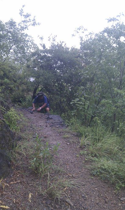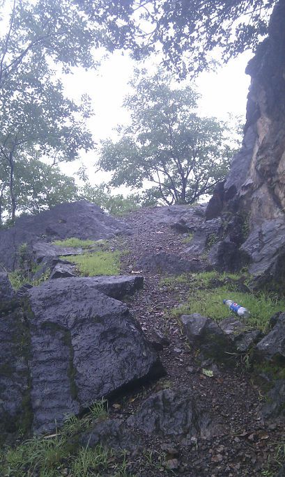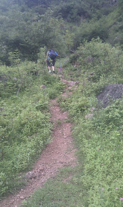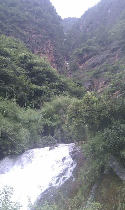 从下金安村出来,走不多远,快到十二点时,发现一条山涧,旁边有一条通往山上的古道,分明就是传说中的茶马古道。择路上行,此时开始下雨了。到了午饭时间,我们选择了一处可以避雨的岩石下面,开始狼吞虎咽简便午餐。餐毕,又匆匆赶路。