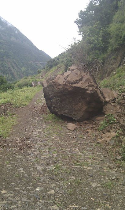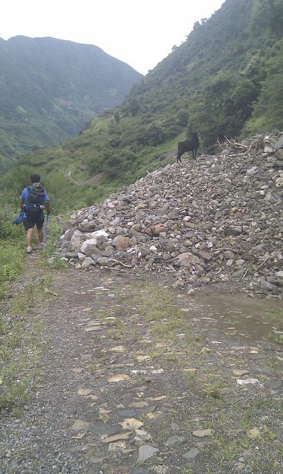 走在曾经的茶马古道上,恍如隔世,不时路过一条条山涧,上面堆积着洪水冲下来的泥石,我们艰难通过,努力辨认正确的路径。不幸的是,但也是这次徒步旅行刺激冒险难忘的地方,在经过一条山涧后只看到一条稍微下行的小路,我们走了这条小路。正确的路可能是往上的,但被泥石覆盖,看不出来。我们走在两旁灌木密集的小路上,走啊走,走了半个多小时,在一条深深的沟壑前,路没了。我们闪过一个念头,赌一赌,与其绕道远远的羊见村,不如沿这沟壑下去,省不少路的。后来,等绕回江边,回望马尾岩的时候,我们一阵后怕,倒抽了一口凉气:那条沟壑似乎通到马尾岩,非常陡峭,到时进退维谷,或一脚踩空,就可能坐“滑梯”滑到金沙江里了。