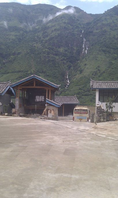 沿着朝西的一条大水箐边的蜿蜒的爬坡公路,坐了半个多小时颠簸不已的微型车,到了产构村。乡政府门口有一家饭馆,我们先解决晚饭问题。点了好几个菜,肉居多,还要了一瓶一斤装的二锅头。饭菜和酒味道不错,频频干杯,好吃。总共才100多元,不贵。随后,联系一个朋友安排住宿,乡政府有招待所,但是住满了。他于是给我们安排了往丽江方向公路边的一个温泉山庄,这个山庄提供食宿。我们很是期待,想着可以好好放松休息一下了,犒劳一下艰难的徒步旅行。