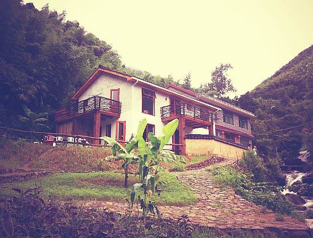 走了约50米左拐后,还是差不多的景观,多了一条小溪,水流还挺急,哗哗地,我心理直打鼓,刚想赶上欧巴,问一句还有多少路,只见他忽地跨过湍急的小溪,推开一扇矮矮的木门,到了!我还没缓过神来,一点也没有酒店或客栈的样子,完全融入在民居里的。