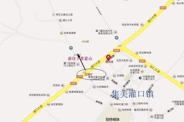 厦门岛内——杏林大桥——灌口(与324国道交叉红绿灯十字路口直行)——菜市场对面大榕树路口右拐,跟循“十里蓝山”路标走—6公里蓝山道(道路陡峭曲折)——十里蓝山。