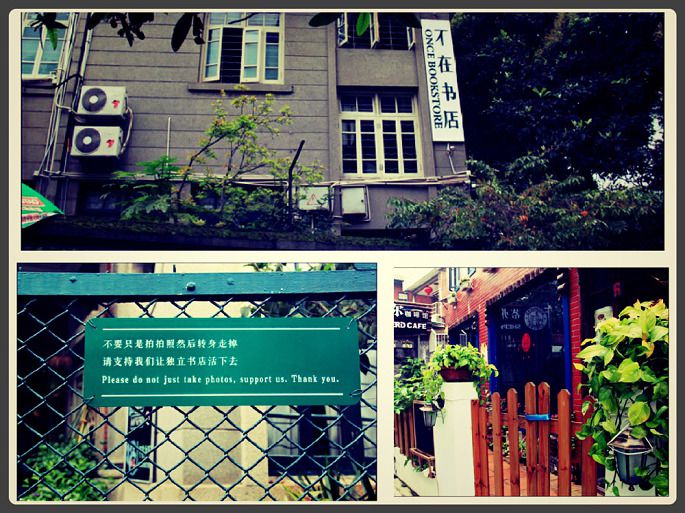 偶然看在当然周刊上面,看到不在书店的图片,搜索了地址,发现它就在华新路,周围许多各式各样的老别墅。唯一都一样的共同点就是,庭院宽阔,植被拥簇,清新氛围明显。主要经营,图书,咖啡,简餐,私房菜。整体环境都很不错,每家都各自的特色。位于四周闹市包围,漫步其中,这里却很安静,适合发呆,看书,咖啡,思考。