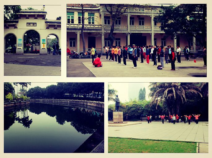 随便走几步都会碰到各种团队的锻炼人群,太极拳,太极剑,广场舞。。。各式各样,顺便说一下,下面这张照片远景处是厦门南乐团的建筑,南音也称“弦管”,是中国现存最古老的乐种之一。两汉、晋、唐、两宋等朝代中原移民把音乐文化带入以泉州为中心的闽南地区,并与当地民间音乐融合,形成了具有中原古乐遗韵的文化表现形式——南音