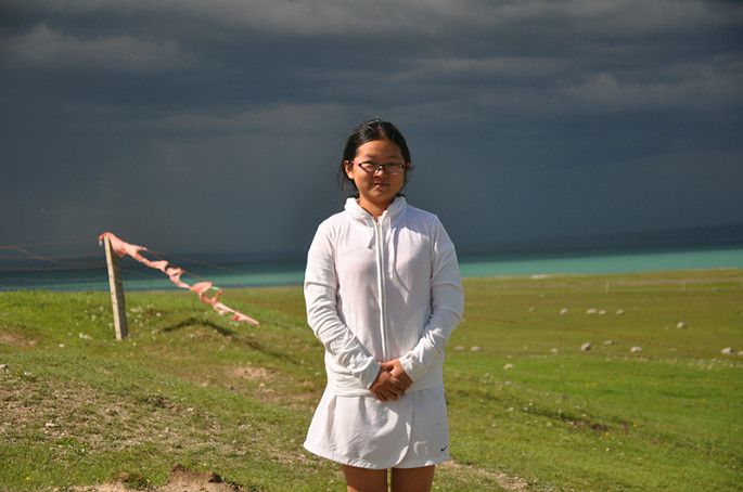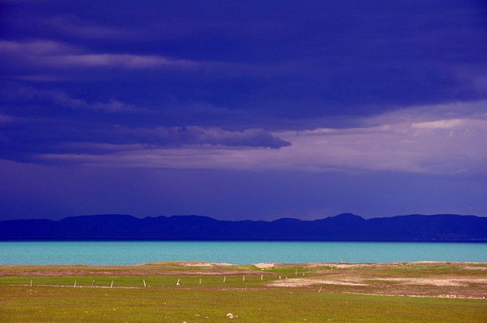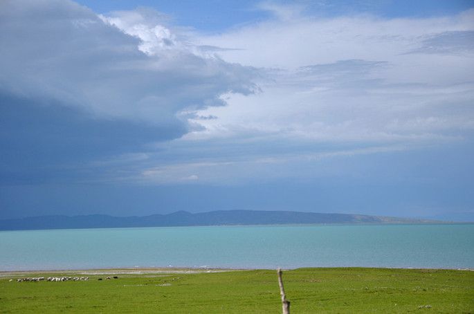 走着走着,天空忽然布满了乌云,乌云的边际与蓝天白云的相接,让水变了颜色。乌云下青海湖的水变成了绿色,像是春天刚刚长出的小草的颜色,清新而明亮。水渐渐变了颜色,越往乌云的边际上,水的颜色就越深。蓝天下的水像是蓝宝石的颜色,深沉又沁人心脾。太阳徘徊在乌云和蓝天之间,这让光线变得时好时坏。看到这样的景色,我感到非常新奇。