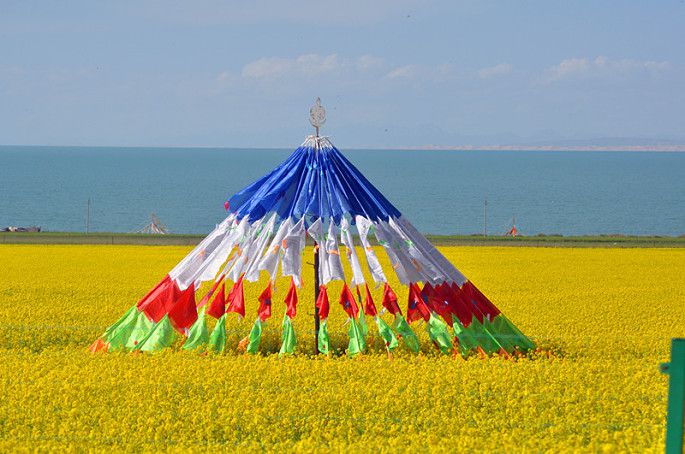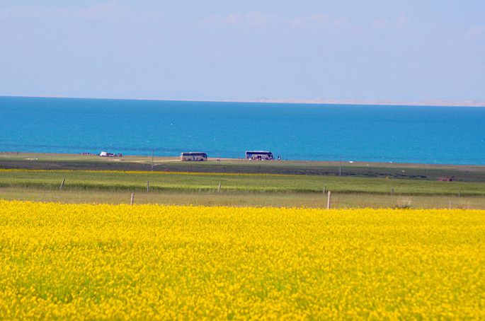 从茶卡盐湖回到沿湖的公路上,已是下午2点。在看看道路两边的风景,也和上午去盐湖的一路不同。左侧是成片的油菜花,花海后面是连绵起伏的小山坡。右侧是一望无际的牧场,在牧场和天空交际的地方,可以隐隐约约看见波光粼粼的湖面。