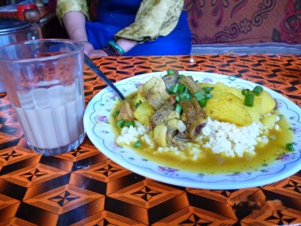 简单的晚餐,米饭有点硬(高原气压原因),不过肉很香。13元(貌似喝了4杯甜茶。。因为实在等得有点久)