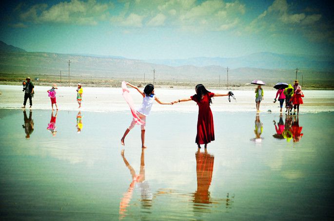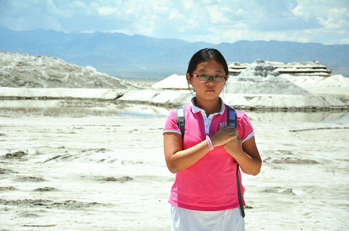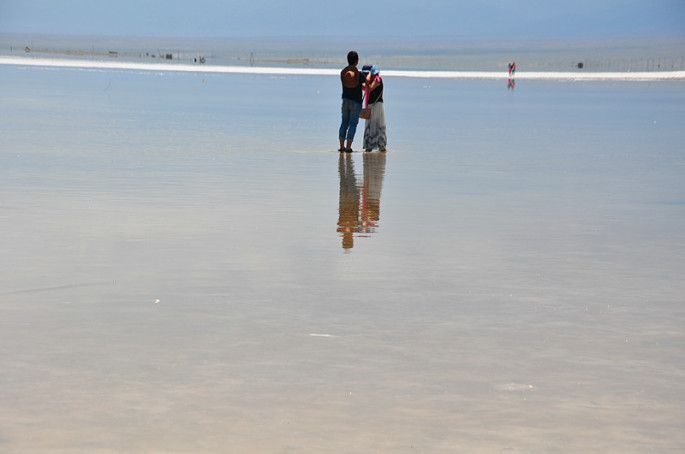 终于看到湖了!我看水很浅,就仗着鞋跟高,在里面走来走去,觉得不过瘾,还踮着脚往深处走。可是右脚一下在水底的盐上没站稳,整个右脚和半个右腿都浸在了卤水中。水被太阳晒得暖暖的,右脚浸在水里感到非常舒服。