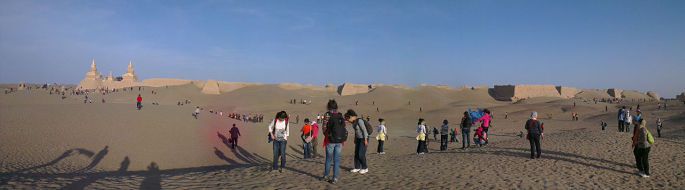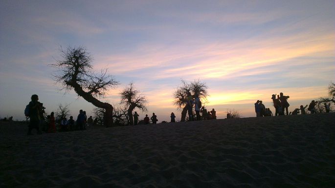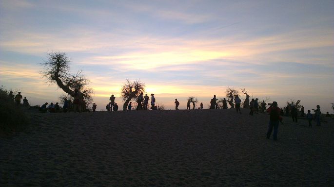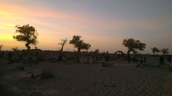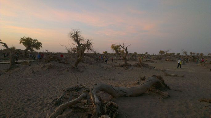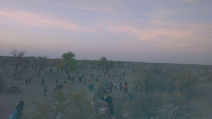 进去后先坐车到黑城,路过怪树林,在车上看到里面全是人,感觉就是树桩旁边树着一个个人桩。在黑城绕了一圈后再坐车回到怪树林,我们等了5-6辆景区车,都没有挤上去啊。。就是差这么点时间,在车上时看到太阳在往下落,等到了怪树林下车时已经日落了。没办法还是进去看看好了。同行的大姐骑骆驼去了。我们就沿着木栈道往出口走,不打算再坐景区车了,太恐怖了。出了景区回住所很晚了,也很累,居然没有热水洗澡,我郁闷了。