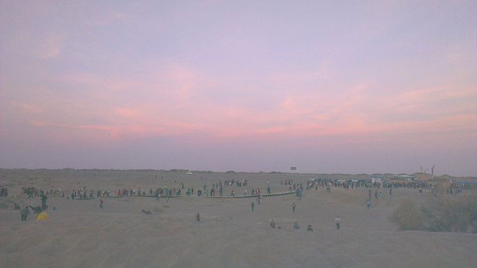 今天是额济纳的行程,一早起来司机6:30来楼下接我们去居延海看日出,到了以后发现全是车,全是人,下车后就随着人群一直往前走,来的早的人已经把高处占领,我们只好随着人群走过一个小沙堆,又一个小沙堆,最后来到芦苇前观看日出。