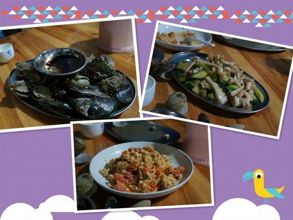 晚上点了青瓜炒鱿鱼、西红柿鸡蛋、扇贝青口蚬