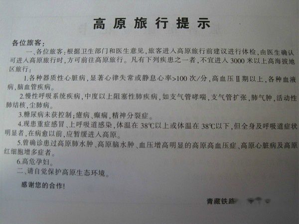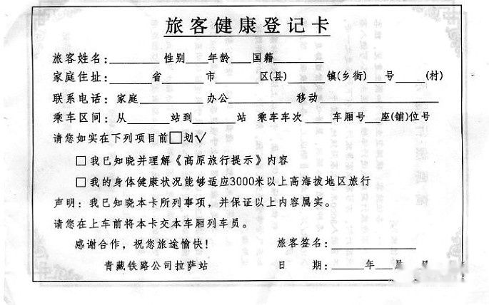 一路上,列车厢里都有加氧气,再加上在西宁适应了4天,自我感觉良好!在列车员发放“旅客健康登记卡”的那一刻,心里想:这就是个别驴友们称之为“死令状”的东东么?