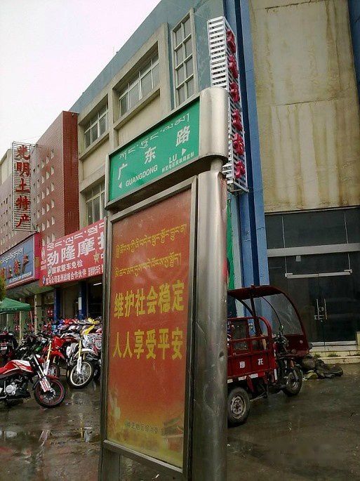 八一镇是林芝地区政治经济及文化中心,海拔2900米,位于尼洋河畔,距雅鲁藏布与尼洋河交汇处30余公里,距拉萨市420公里。这算的上西藏地区第三大城市了,街道两边的房屋已经是现代化的为主,藏式的比较少见。在我们住的宾馆不远处意外发现了这路牌,世界真是小啊,转来转去还是在‘广东’混,呵~