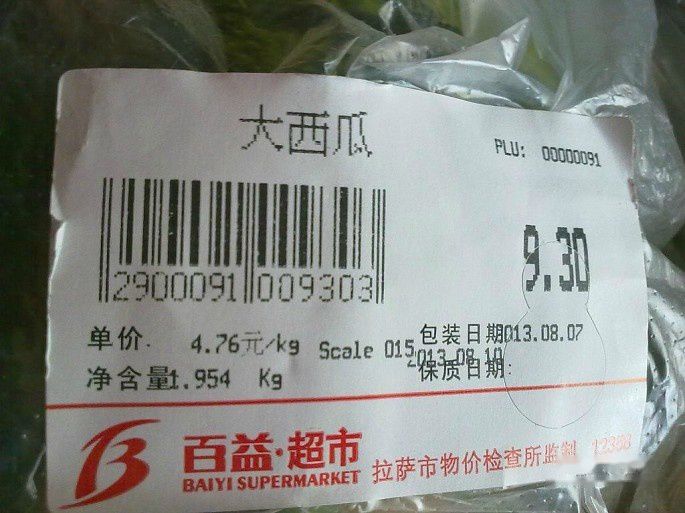 7号那天下午,我们就到拉萨的百益超市进行“入货”把各种好吃的,想买的统统买,其中必不可少的就是水果,因为在西藏实在太少机会吃青菜了,别人一餐没肉吃都难受,我是一餐没青菜总觉得缺点儿什么,一天不吃水果也总觉得不习惯,因此水果必须得保证。 我和小琪都有个共同的爱好——吃西瓜!这是我们提上火车吃的西瓜(这是其中之一,我们是一人一个),在我们拿着汤勺在吃西瓜时,引来了周围人的注视,我们俩吃着吃着都不禁笑了!估计,有人会想这俩女孩怎么那么能吃?呵~