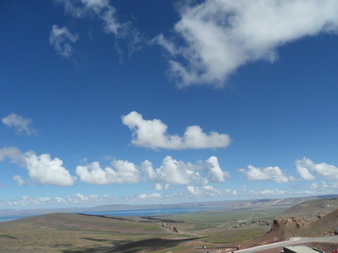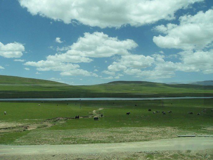 下面的照片是火车经过措那湖所拍的景象,一路上,总觉得相机咔嚓咔擦拍不停都无法表达自己对眼前景色的喜爱。列车很快就到达了那曲。那曲是最能代表羌塘的地区,那曲的意思是“黑河”。黑河是怒江的上游,水色发黑,因而得名。就是这黑色的河流滋润了羌塘草原。羌塘草原怀抱中的碧玉——错那湖迎面扑来。据说措那湖是世界海拔最高的淡水湖,有400多平方公里,略小于羊卓雍湖,却大于西藏三大圣湖之一的玛旁雍湖。是藏民心目中的圣湖,也是青藏铁路最近的湖。湖水呈蓝绿色,围绕着绿色的草甸,湖面波光粼粼,上空云朵变幻莫测,如油画般美丽。