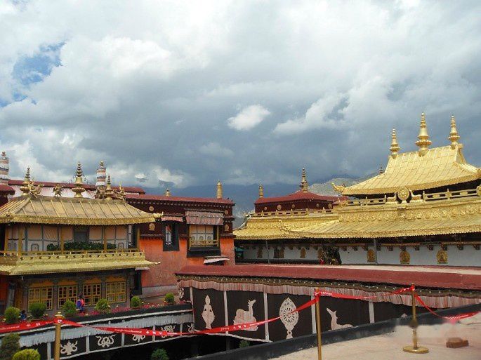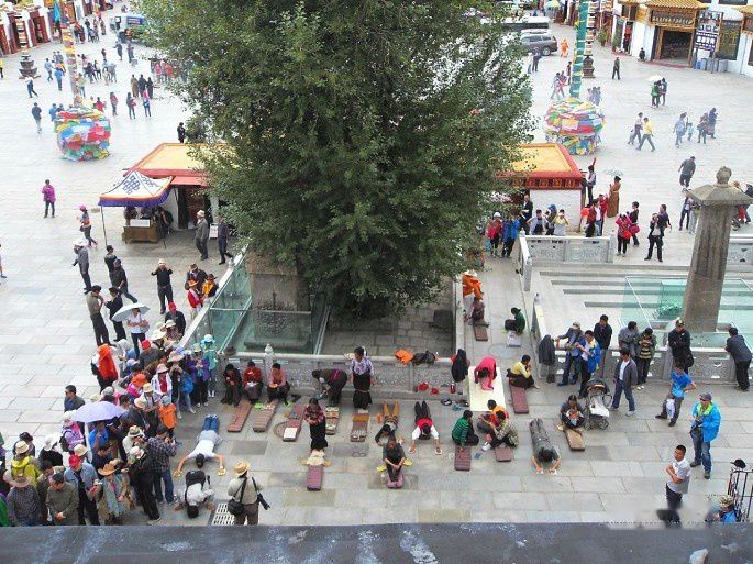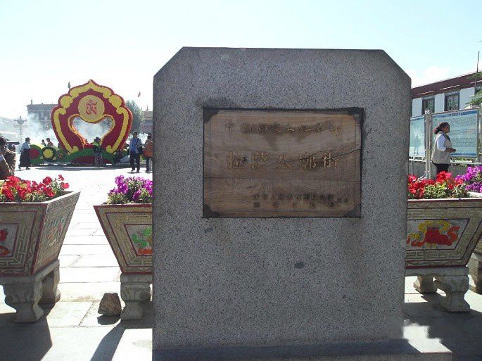 大昭寺前,传说中的艳遇墙(其实叫朝佛墙)不见咯,拆了!被听闻以前游人喜欢成群结队坐在那看人磕头诵经晒太阳。金顶是藏族宫殿、寺院、佛塔建筑的重要组成部分和高级建筑装饰,顶面为铜质镀金桶型长瓦,是藏民族建筑特有的一大奇观。目的是让主体建筑突出于群殿和城镇建筑群之上,更显宏伟气势。