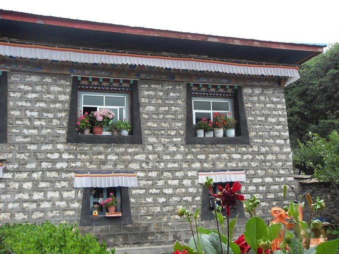 她家里的外墙虽然漂亮,可是里面的布局算不上豪华,不过充满了浓郁的民族风格。她说,藏民信徒朝拜者一般家里都会有些在我们眼里值钱的东西,不过有很多都会拿去供奉进行祈福了。他们村里目前进行了银器加工,都是自己村里人进行手工制作的。有银碗、银腰带、银筷子以及各种银饰品。至于质量如何,我则是不清楚了。碍于当地的风俗,也就没有随便乱拍主人屋里物品摆放的照片。她家的院子和屋子外面还是挺漂亮的,我喜欢这种风格!注重门窗装饰,外墙色彩简单大方,多为对比强烈之色彩;据女孩描述,他们村的房子或者家具都是大家互相帮助建起来做好的,不计较多少钱的事情,而且他说藏族人都不太喜欢存钱的,曾有一段时间在八一镇上有一间银行因没有业务而关闭。