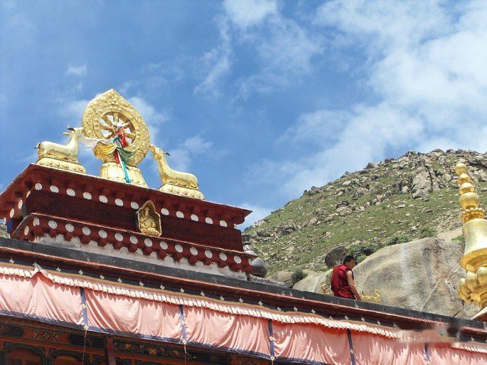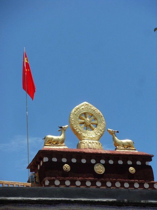 西藏寺院主殿顶都有双鹿和法轮。轮是南传、汉传、藏传佛教共通象徵物,表义佛法;轮心表戒,轴表慧,外圈表定。双鹿不是指普通的鹿,而是某种特殊的鹿,传说这种动物对声音痴迷,猎人吹笛它们就会安定不动束手就擒。佛教使用这标志不是寓意“呆”,而是寓意对修学佛法的专注。藏传佛教认为:位于双鹿中间的法轮是八幅轮,象征佛教法轮常转;左右两边的双鹿代表信徒,他们专心致志地听佛讲法。我们的眼睛所看到的是两只鹿,其实它应该是两只犀牛。按照佛教说法,犀牛是具备慈悲心性。法轮的圆心代表佛教三学中的戒学,法轮的八根幅条代表慧学,八幅的外圆代表定学。八根幅条又代表八圣道支,这样说来佛陀所讲全部佛理无不包括在三学、八圣道支内。双鹿又代表佛教所说的方便与智慧,用一句通俗的话来讲,方便就是菩提心,智慧就是空性,二者不可离异,依靠悲智双运获得正果。法轮又代表显宗,双鹿代表密宗,藏传佛教主张修习佛法必须显密二宗兼备,不可偏颇一方。综合以上诸多解释,法轮双鹿这件艺术作品表示宏扬佛教,广济天下。