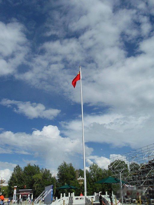 布达拉宫广场,广场很开阔,北边正中有个台阶围栏,围栏中央立着旗杆,五星红旗艳耀于蓝天白云间,迎风招展。围栏左右各有一名英姿飒爽的武警看守,不远处还有肃穆庄严的纪念碑,纪念碑围栏很宽,也有武警站岗。