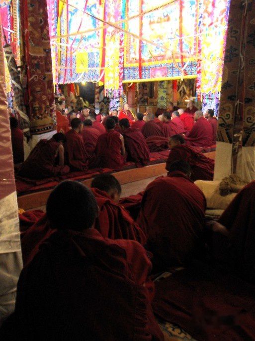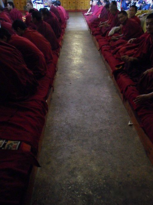 我们很荣幸,刚好遇上了他们的辩经考试。问了一喇嘛,辩经场在哪里,他说今天是他们的考试,全都集中在大殿里进行,只见喇嘛全都坐在各自的位置上,盘腿而坐。中间坐着三个估计是考官,考官发问,辩经的喇嘛单独站在考官正对的过道,然后就开始辩经,我什么都听不懂~~~只知道在此过程他们会有鼓掌助威,舞动念珠、拉袍撩衣、来回踱步的动作,有时候,众喇嘛会一起高呼。一个喇嘛至少辩经20分钟起。