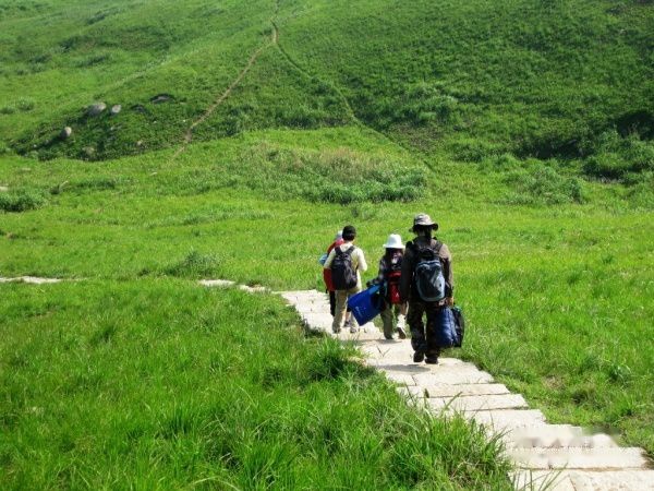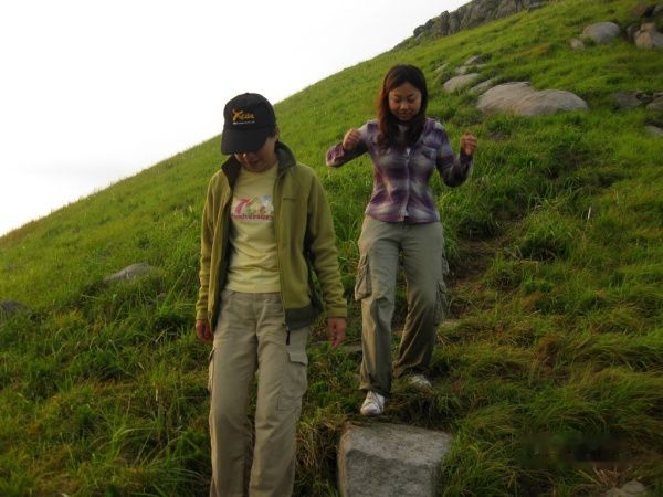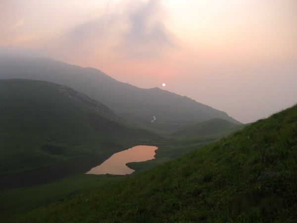 顺着小路拾梯而下,我们来到小天湖,因为有着连绵绿草的映衬,小天湖比大天湖要秀美的多了,湖边延伸出来的那块草地就是我们扎营的目的地。放下背包后大家一身轻松,席地而坐,四周满山的绿包围着我们。不用赶路了,留下来随心地打发时间,等待落日。
