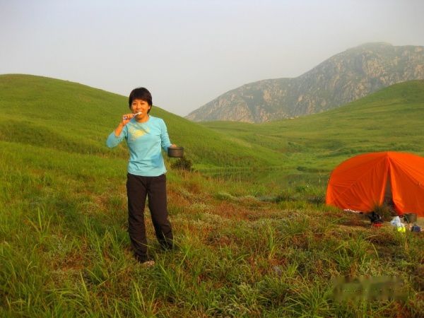 第二天五点多我就醒了,野外的清晨还是凉意十足,湖面上都罩着薄雾,露水非常大,幸好带了件抓绒保暖,披上就开始爬山赶着看日出,穿越草丛我的裤子半截还有鞋子全湿透了,不过也顾不上许多,直往上爬,结果我们起来的还是了晚点,爬到半山,太阳已经出来了。上山的路有点徒不太好走,下山时因为前头爬得太快,我脚有点发软,几乎一半是蹲着下来。