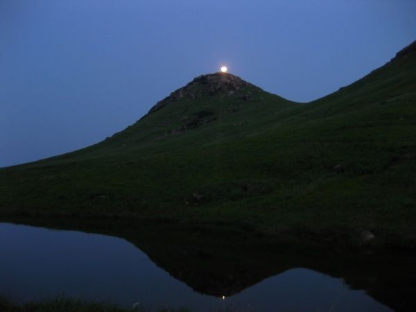 夜幕降临,叮当指着山顶大叫一声,哇,那个谁好牛啊,这时候还在山顶。我们闻声抬头一望,细看才知道原来不是灯,是月亮刚刚从山头上钻出来了。赶紧的个个拿相机狂闪。不过霎那间月亮已经升起来了,倒映在小天湖上,美呆了。