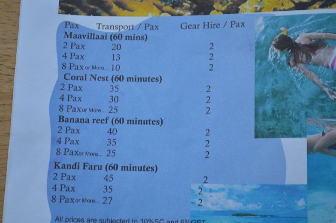 D1包快艇上岛USD15/人共30元,D5坐轮渡从Maafushi到马累USD2/人共4元,从马累码头打的到计机场USD1/人共2元,从机场码头坐渡轮到机场USD1/人共2元。总共USD38元,折合人民币大约234元,给现金。