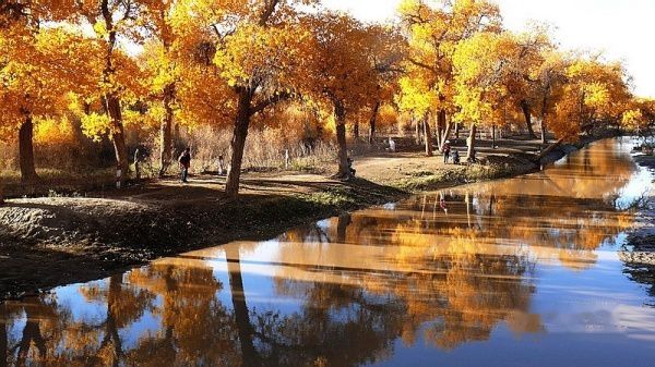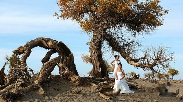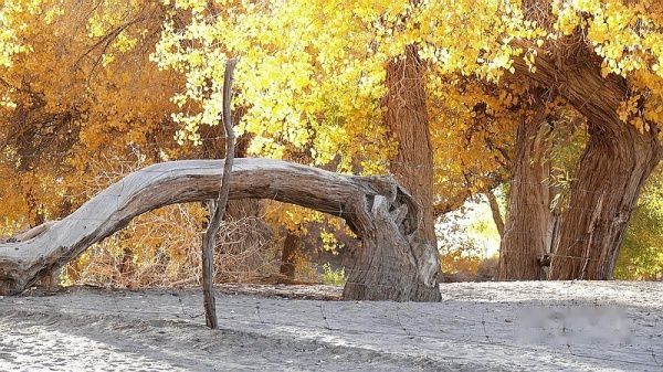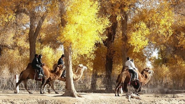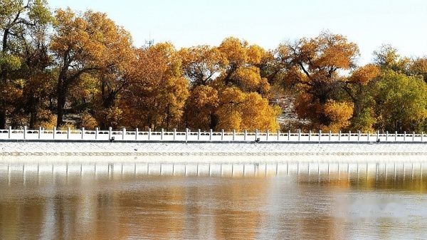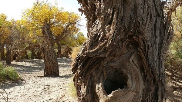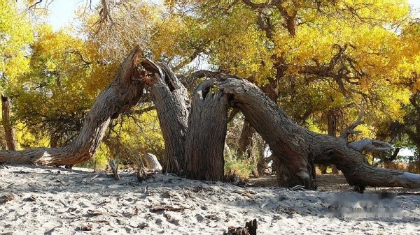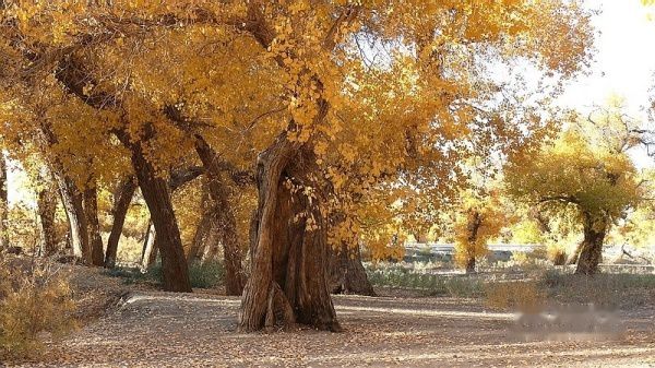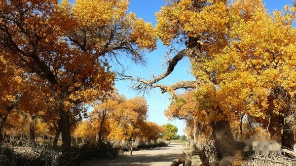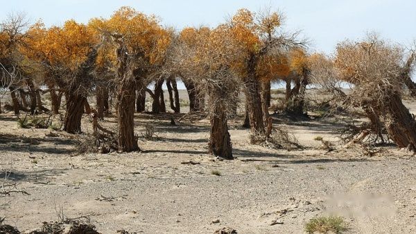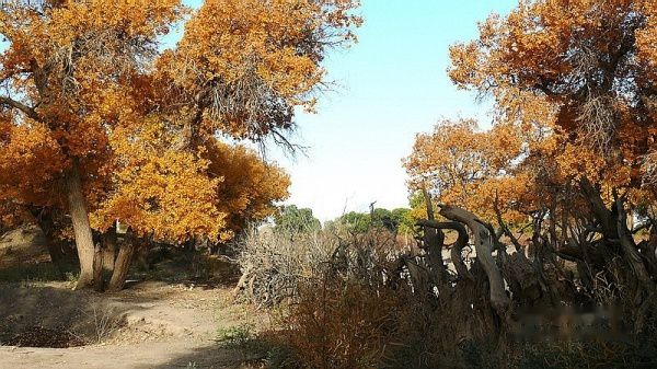 凌晨3:51分,列车提前到站酒泉。我们一行4人睡眼惺惺,带上行囊,在漆黑的天空下被“赶下”了火车。怕误了返家,我出站后就直奔售票处购10月17日k454次从嘉峪关至江油的火车票,售票大厅空无一人,售票员说车票己售完。提前10天预购车票也会卖完了?没得谁给你解释,总之窗口已无票可买。怎么办?我忽然想到了旅行社黄经理,也许她能帮上忙〔后来真是黄经理帮买了2张返程车票,太感谢了哦〕。此时,酒泉还完全被夜幕笼罩,在瑟瑟秋风下,我们只好在火车站一个简陋小旅店花30元开了一间房,暂时休息待天明。7点过,我们打的前往酒泉车站〔西关汽车站〕,旅行社小张为我们送来了预订的至额济纳的大巴车票〔如果没提前预订,将只能买到11:30的班车票了〕。8:38分,我们乘坐酒泉至内蒙额济纳旗〔达来呼布镇〕的大巴出发了,两地相距近400公里,全为双向单车道,柏油路面,道路平直,路况不错。途经酒泉卫星发射中心地段,属军事重地,多处禁止拍摄。在五个小时的行车途中,除两地城市和经过的村落有一些树丛外,基本上都是一望无边的沙漠戈壁,沙漠覆盖的大地只见星星点点的灌木丛,还顽强的挺立在那里。特别是车行一半时间左右,窗外所见除了沙漠没有一点生命迹象,甚是荒凉。中途没有就餐的地方,只有自带一些小食品充饥。13:40分大巴驶进额济纳旗汽车站。车站很陈旧,你不抬头看那车站的招牌,还误以为驶入了农家院落。一下车,就被张罗住宿的商贩所包围,要价也非常低廉。为出行方便和省事,我们就近住进了交通招待所〔电话0483-6526081〕,住的普通双人间,有公用卫生间和淋浴房,房价每天每间50元,房间干净整洁,有数字彩电看,也算收费低廉,物有所值。但据老板讲,我们来的正是时候,国庆大假期间每间房价是200元,今天刚下调房价。放下行囊,简单疏理后,我们就去街对面停车处联系包车事宜。经讨价还价,最终选租一东风小康8座面包车,全程租用2天,每天租金300元〔不管司机的用餐和门票〕。师傅是蒙古族,名:乌拉〔车号:蒙M22750电话:13514835937〕。联系妥当后,我们回招待所小憩一会,15:00由招待所步行前往一道桥至二道桥。大家都是第一次看见金色胡杨,兴奋不已,一路狂拍,后来发现精彩还在后头。18:50分左右又步行返回城里