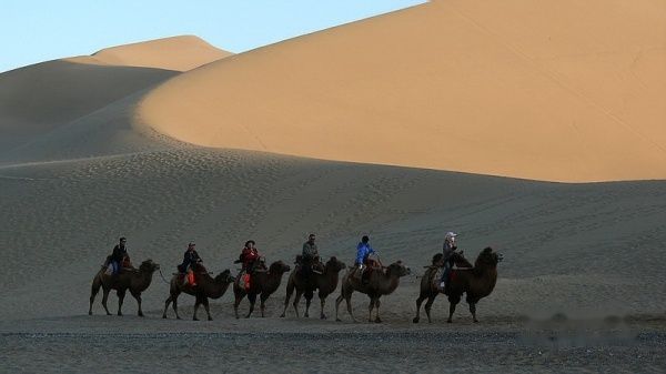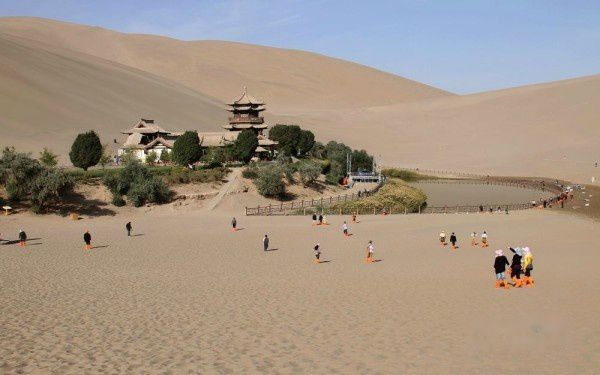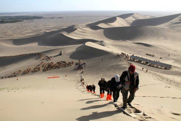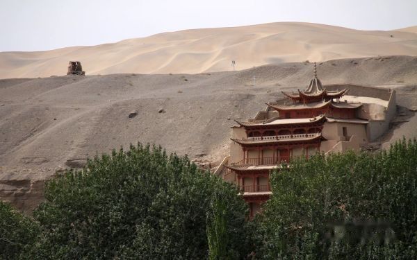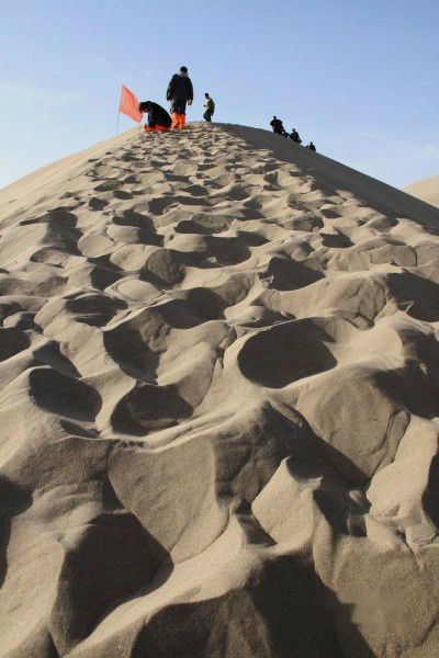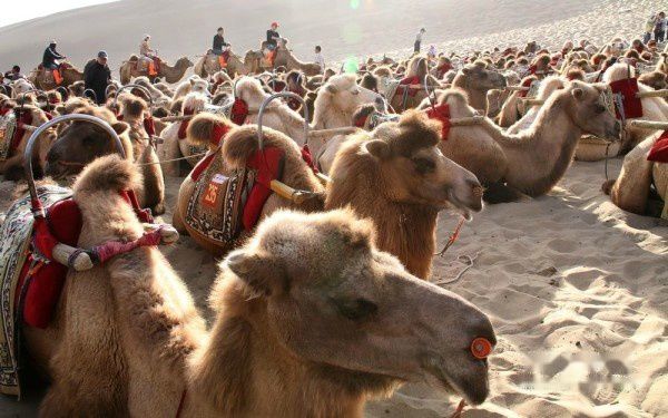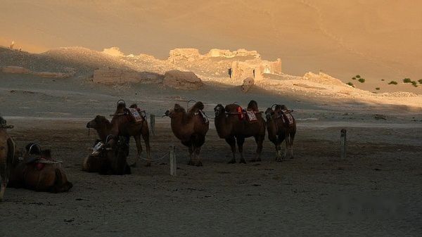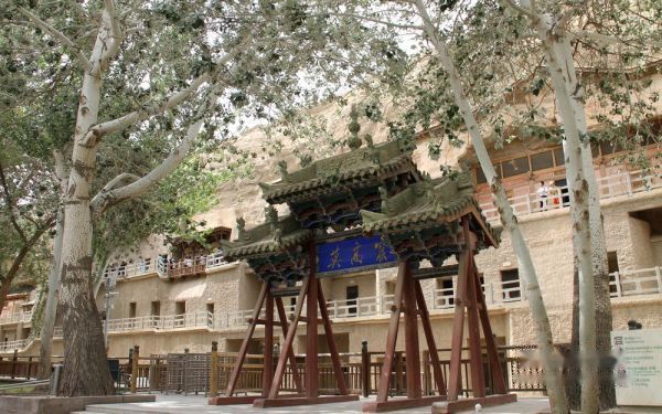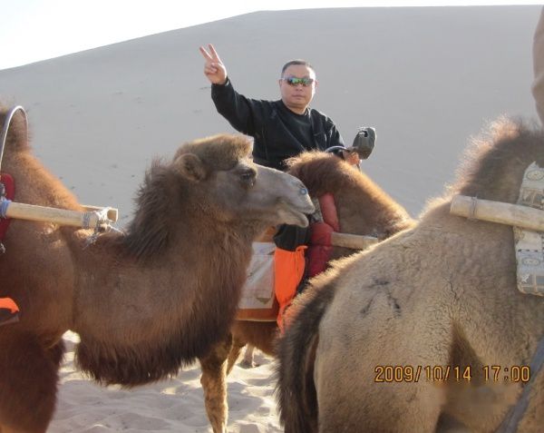 我们属旅行社接待的散客,每天跟团的导游、车辆以及参团游客都在调整变更。上午11:50分旅行社将住在城区各宾馆的游客共9人组团前往莫高窟参观〔门票每人160元〕。莫高窟名气很大,是我这次西北行的必选景点,神往已久。但参观后非常令人失望。这主要是景区管理使人不悦。验票进入景区开始,游客就被严格监控,保安三步一岗、五步一哨,还有布满各处的电子眼,讲解员一副阴冷面孔、一腔阴沉语调,眼睛不时盯着每位游客的一举一动。不准乱摸、不准照像、不准**电筒。在洞窟外的走廊上也不许你照像〔但可笑的是,在仅一步之遥的木围栏外你却可以随便照〕。讲解员开哪个洞窟你就乖乖跟着看,简单讲解一下你就必须尽快离开。在如此威严冷酷和短暂阴暗的氛围中, 你彷佛进入了戒备森严的教管所,完全没有置身艺术宝库的雅兴,只有花钱自投落网的无奈和愤怒!匆匆离开莫高窟后,我们来到了鸣沙山和月牙泉景区〔门票每人120元〕,第一次坐上了“沙漠之舟”〔骑骆驼每人80元〕,19点返回阳关大酒店。