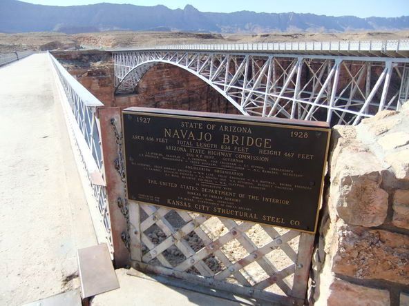 停好车,来到大桥上,没想到竟有两座桥。虽然这里的峡谷远没有大峡谷高,也没有大峡谷宽,但大桥们却很雄伟。这是大桥的名字——NAVAJO BRIDGE(纳瓦霍大桥),看这块牌子应该是1927年到1928年修建