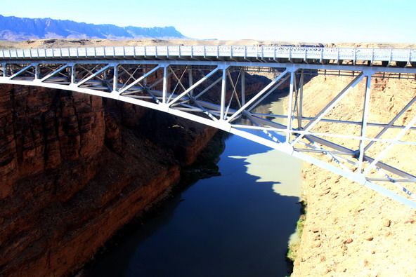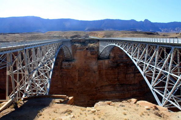 纳瓦霍大桥 在亚利桑那州的格伦峡谷的国家休闲区,拱肩长467英尺,背倚亚利桑那州壁立千仞的红崖,伴着1995年落成的新桥,一起横跨于大理石峡谷和科罗拉多河之上。旧桥现在专供游人徒步往返。(摘自网络)