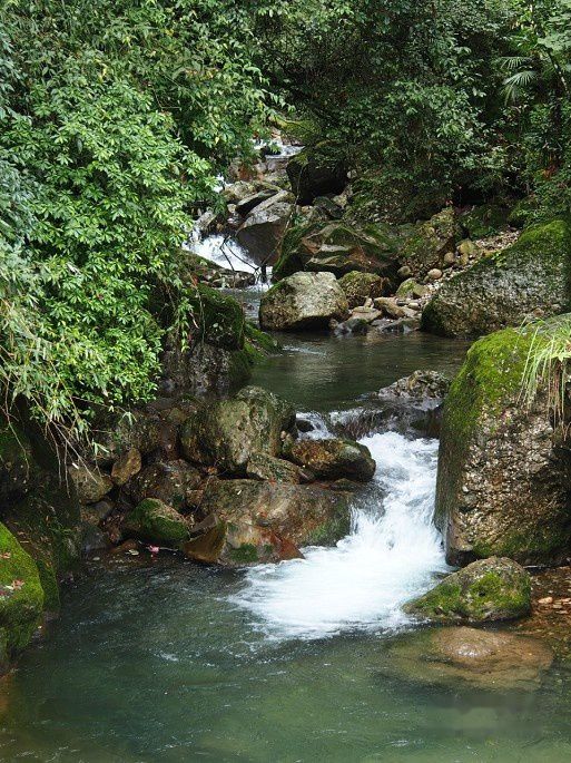 这是沟口的一小段,正在修路。跨过这段,扑面而来的是满目青翠,飞流瀑布,溪水潺潺,仿佛进入了一幅天然画卷。一路走走拍拍,很是惬意。