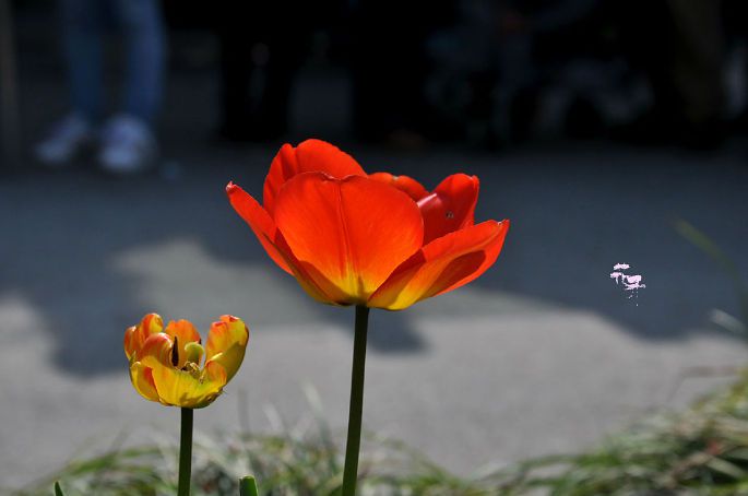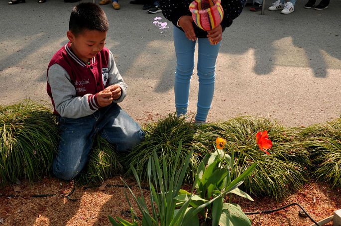 这个小男孩特别可爱,他在地上捡谷子撒,朋友看到说挺美的,旁边的花朵也很美,让他把谷子往花的方向撒(当时有风,正好可以把谷子吹起来)然后他抓起一把谷子果断倒进了那朵红色的花里,然后花就很可怜的……残了。