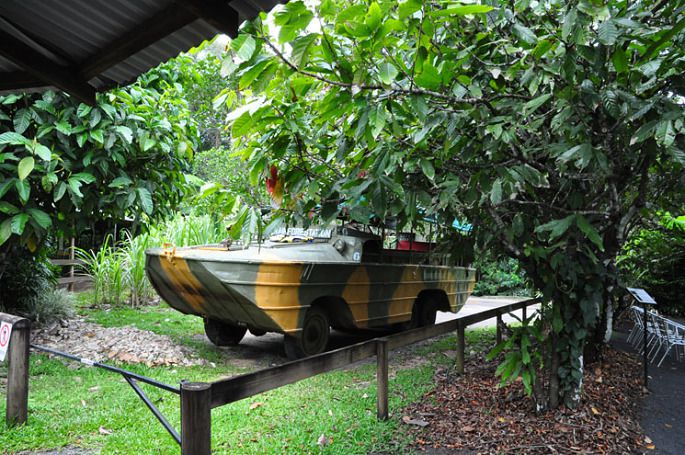 2月16日,今天的行程是去凱恩斯,早上5点半起床,6点用早餐,6点半前往机场,9点15分乘上澳航的QF924次航班前往凱恩斯。凯恩斯在悉尼的北面,离赤道更近,因此气温也比悉尼要高不少。中午12点15分到达凱恩斯,地导小王已在门口接我们了。接着带我们去了热带雨林,热带雨林位于昆士兰州东北部,从墨斯曼一直绵延至凯恩斯,雨林至少有上亿年的历史,是地球上最古老的雨林区,不只蕴含著许多濒临绝种的动植物,它本身更就像是地球的生态进化史。1988年这里被列入自然类的世界遗产的热带雨林区,在那里我们用了自助午餐。餐后小王带我们进入热带雨林游览,先看当地土族人展示古代的归去来器,这东西抛出去后会自动转回来,我们每个人也亲自体验了一下。又看土族人吹奏迪吉里杜管,和抛飞枪表演。接下来大家乘坐二战时期遗留下的军用水陆两用车进入丛林,一路上导游给我们讲解了沿路上的热带植物,最后在雨林中的一个小湖中转了一圈后回到原处。下车后去土族歌舞表演场观看歌舞表演,看完表演后已是下午3点钟了。地导又带我们去库兰达市场,根据行程表上规定要在那里待2个小时,我们到那里时大部份商店已关门了。据小王说凱恩斯的商店基本上在下午3点左右就开始关门了,因此我们在那里转了一圈也就花了半个多小时就结束了。其实库兰达市场也就是一个专门经营旅游商品的市场。最后我们去了大堡礁的船码头,办理明天的自费项目。我们的行程中不包含乘直升飞机、乘热气球、潜水等內容,因此如要参加就必须自费。我俩由于年龄较大也就沒参加,下午5点多去饭店用晚餐,餐后送我们去酒店休息。
