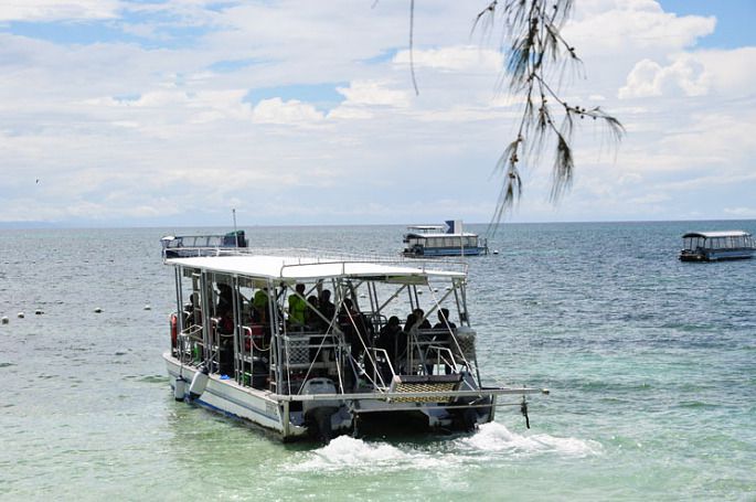 2月17日,今天早上7点用餐,8点乘车去码头前往大堡礁中的一个小岛--绿岛。大堡礁由超过2900个珊瑚群和900个珊瑚岛组成,是世界上规模最大的珊瑚群落和海洋公园。大堡礁之大,从月亮上也能观测到(长约2300公里)。大堡礁地带拥有世界上种类最多的海洋生命,包括:450种珊瑚,1500种鱼类和4000种软体动物。大堡礁每立方米里拥有的动植物种类是世界上任何同等面积的自然环境下(包括热带雨林)都无法比拟的。9点半轮船开出,1个小时后到达绿岛。接着換乘玻璃底船向大海深处开去,一路上可观看海底的珊瑚礁和水下的鱼儿,大约半个多小时后再回到原来的船上用餐(也是自助餐)。这时一场倾盆大雨从天而降,等我们吃完饭后雨又不下了。餐后我俩去岛上,更換了游泳衣在海边玩耍。这里的海滩真的很漂亮,蓝蓝的天,绿绿的水。我俩下到海里拍了些照片和视频,由于太阳太猛怕晒得太厉害,在海中我俩玩了1个多小时就回到岸上。換好衣服后延着环岛的木栈道游览着,一直走到栈道的尽头,原以为可走到乘船的码头,谁知只俢了大半,还有一段沒造好(其实沿着海滩一直走过去就可到达码头)。我俩不敢冐险从原路返回,下午3点半回到码头4点船准时开出。回到凯恩斯码头后,我们又在凱恩斯码头逛了一圈,码头边是凯恩斯政府花巨资俢建的木栈道,岸边各种精致的咖啡馆、餐厅林立,码头内停泊着各式各样的豪华游船以及各色私人游艇。最后再步行至昨天吃饭的饭店用晚餐,餐后地导将我们送回到酒店。