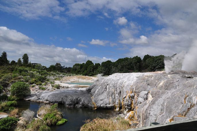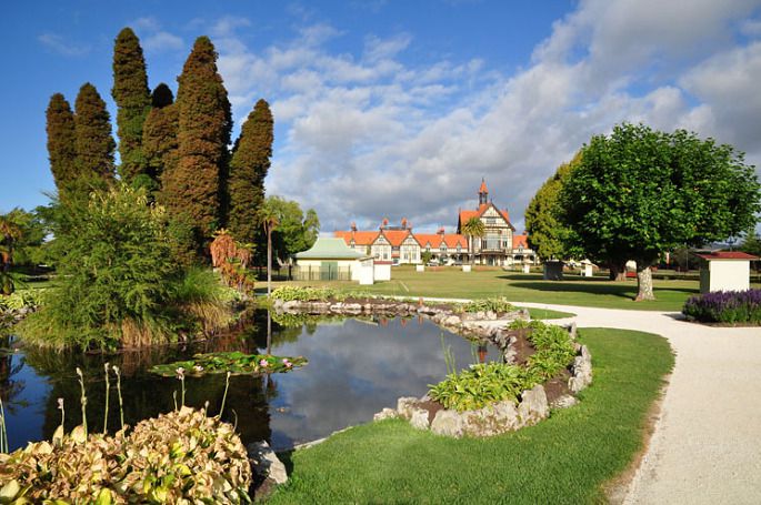 2月21日,早上9点用餐,9点半乘车前往罗托鲁阿市毛利文化地热中心。它是南半球最有名的泥火山和温泉区,也是当地毛利人集居的首府。我们到达那里已经是中午时分了,用完午餐后进入毛利文化地热中心参观。先是地导小王带我们参观,接着一部份游客自费去观看了毛利人的歌舞表演,(我俩沒参加)我俩再细细的游览了地热区。这里的地热喷泉很独特,其中有的喷泉向高空射出高达30米的热水柱,除此,硅石台地、沸腾的泥浆及独特的植被都使人赞叹。我俩慢慢的欣赏着,不时拍些照片。下午又去一个自费的游乐场,原本我俩沒参加,后来看看全团只省我俩不去也只能参加了。其实里面也就是参观一些动植物,先是参观了新西兰的国宝“奇异鸟”的人工孵化过程介绍,看了看圈养的奇异鸟。再乘船玩了一下冲浪,再在游乐场内转了一圈,下午6点又去了政府花园。这是罗托鲁阿市十分亮丽的景点。那里有一座英国伊利莎白式的橘红色顶的群楼,在绿树、草地和水池的衬映下,显得非常突出,非常漂亮。吸引着众多的游客。那座建筑是英国人占领新西兰后,帮助土著族毛利人首领设计并建造的宫殿。据说曾为毛利族公主所住。后受到西方文化影响,成为市民的娱乐场所。现开辟为罗托鲁瓦的旅游景点。广场一角矗立着一座新西兰军人的纪念性雕塑。碑座上标着“1898——1902.布尔战争”的记载。说明新西兰也协同英国参于了南非的布尔战争。新西兰还不到五百年历史,所以这些都成了该国的历史古迹了。我们在那里也拍了很多照片,半个小时后去饭店用餐,餐后回旅店休息。