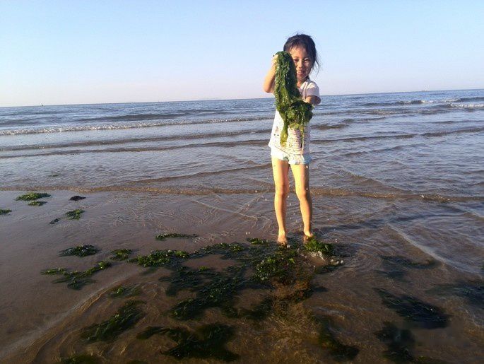 随后到海边,人不少。下海玩水,暖暖高兴坏了,捞海带,逐浪花,夕阳下阵阵笑声飘飘,怎么一个美字了得!