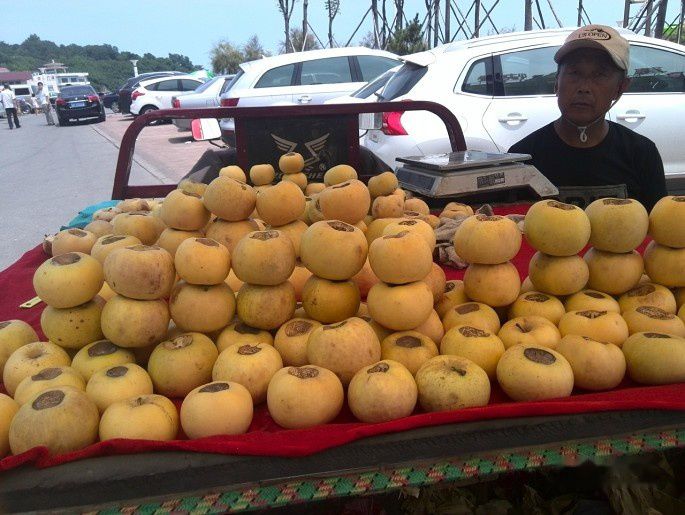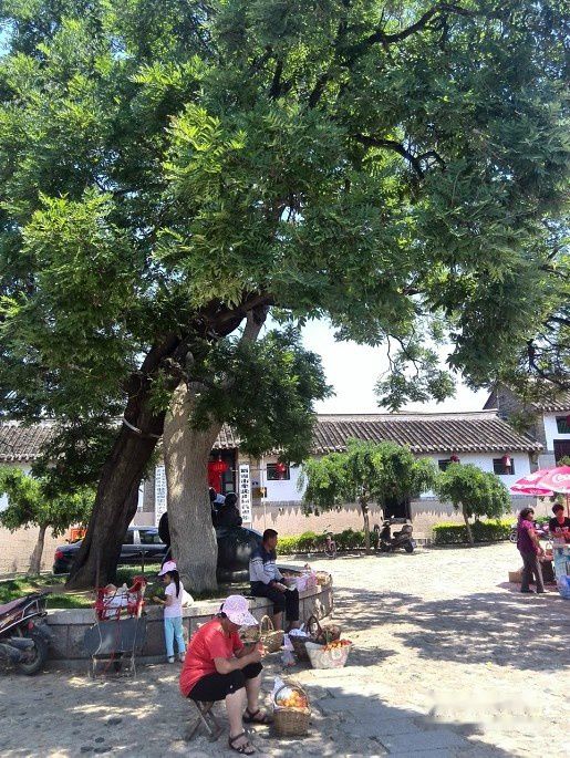 到栖霞,下车步行到牟氏庄园,十多分钟。街面还蛮干净。庄园前大槐树下,几个老乡在卖桃、杏。游客不多,三三两两。