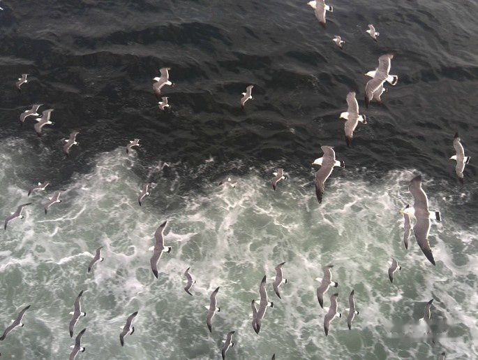 有人在拿料喂海鸟,更多的人在观赏、拍照。鸟儿在头顶飞鸣,感觉就是一个爽!船两侧和正后方浪花水流,海鸟成群随着飞翔,忽上忽下,忽左忽右,造型多变,蔚为壮观。