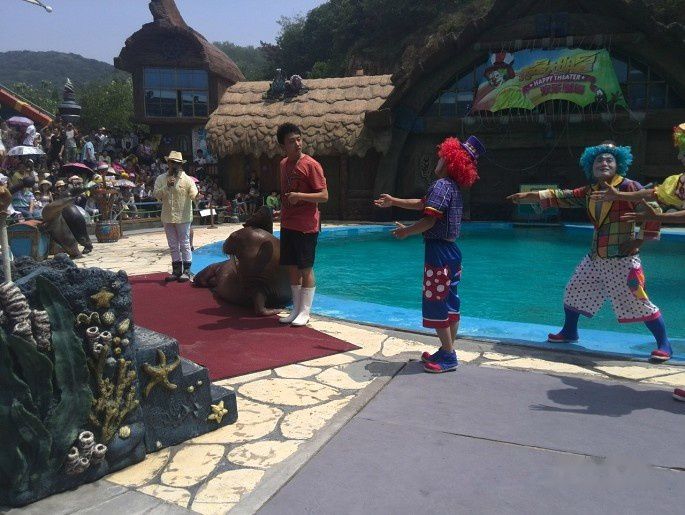 老虎滩海洋公园人不少,海豚表演与欢乐剧场小丑、海狮、海象、水獭的联袂演出蛮精彩,灼热阳光照耀下的人阵阵欢呼。很有意思的一幕:海豚表演与欢乐剧场,先后两处表演,挑选观众参与环节,都“弄”到了同一姑娘,且一看就不是托,也非专门安排,姑娘和男朋友一起。真巧了!