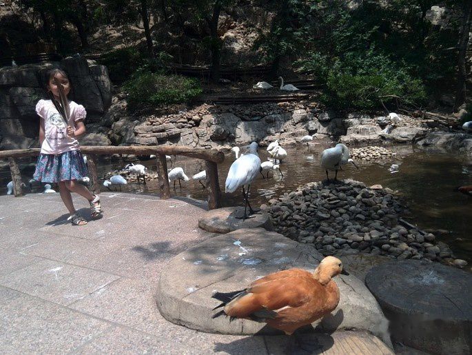 鸟语林各色鸟儿花枝招展,山坡乱窜,与人相混,孔雀、红腹锦鸡、麻鸭、火烈鸟......。暖暖超兴奋,还捡了些漂亮羽毛。